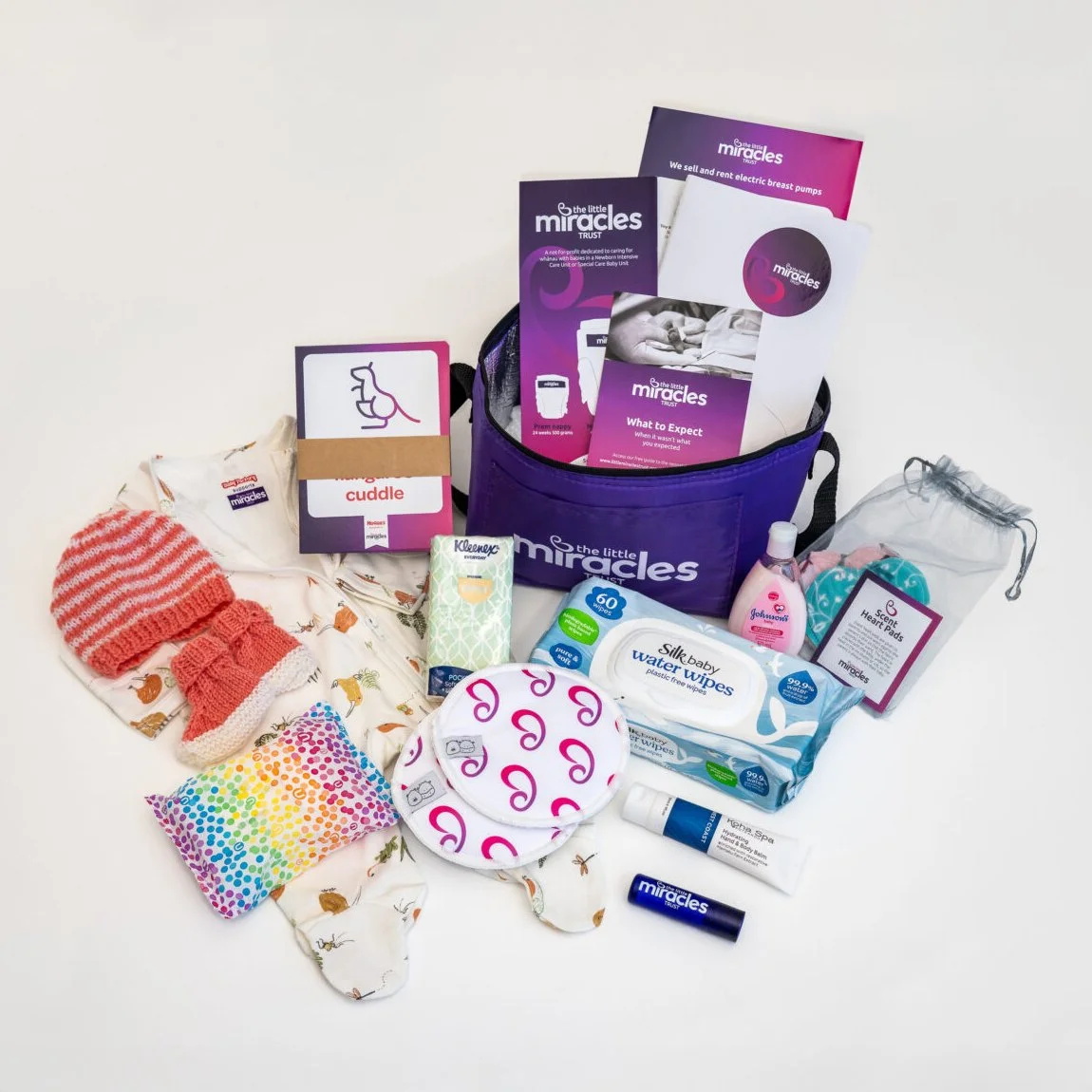Each year The Little Miracles Trust supply more than 4,000 emergency care packs to Aotearoa's 23 neonatal units: one for each whanau who has a baby admitted to a unit. These iconic purple packs are carefully curated. They are made up of practical yet thoughtful items which will be of use during the whanau’s journey.